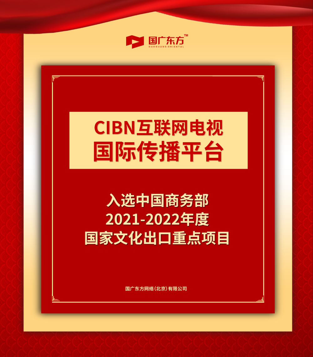 根据《文化产品和服务出口指导目录》(商务部等部门2012年第3号,公告)和《商务部办公厅 中央宣传部办公厅 财政部办公厅 文化和旅游部办公厅 广电总局办公厅关于组织申报2021-2022年度国家文化出口重点企业和重点项目的通知》(商办服贸函〔2021〕146号)要求,经省(自治区、直辖市、计划单列市)相关主管部门初审、第三方专业机构审核、专家评审和有关部门复核等程序,初步认定国广东方网络(北京)有限公司的“CIBN互联网电视国际传播平台”等122个项目为2021-2022年度国家文化出口重点项目。