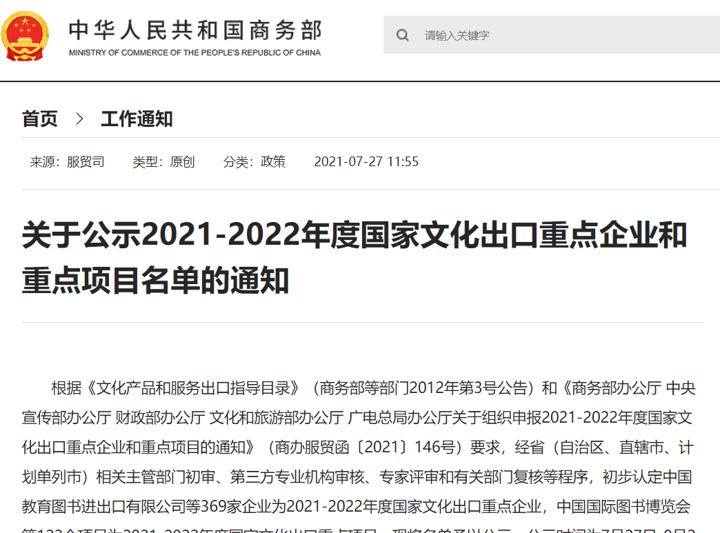 7月27日,商务部、中宣部、财政部、文化部、国家新闻出版广电总局五部委联合公示《2021-2022年度国家文化出口重点企业和重点项目名单》。